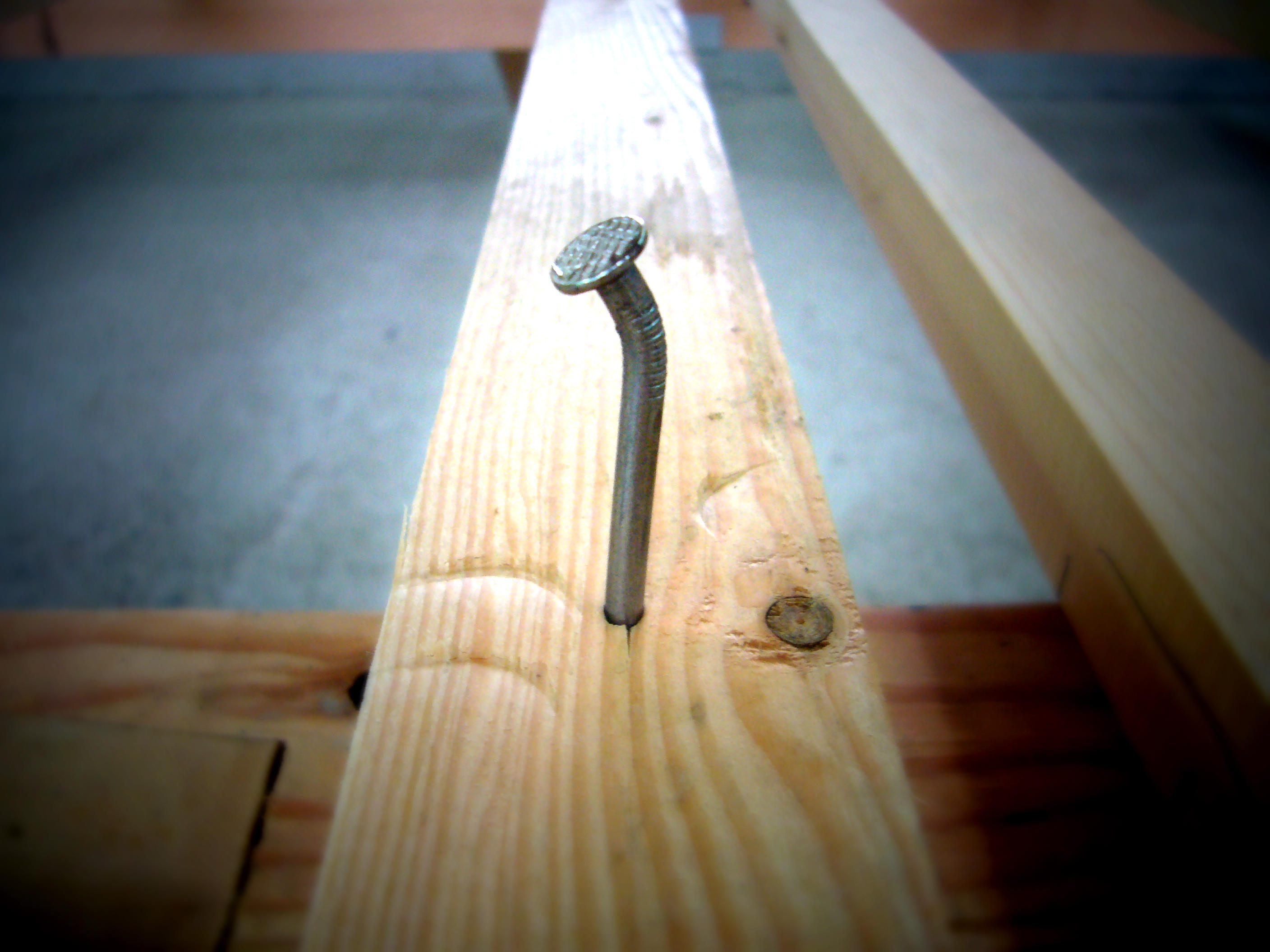 屋根にのぼり、垂木と母屋に打ち付けた90の釘。