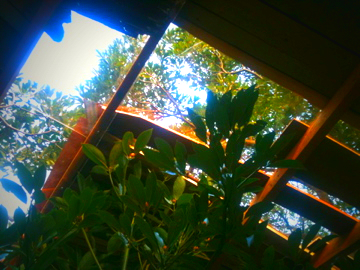 朽ちた屋根のすき間から空と緑がのぞく感じ。
