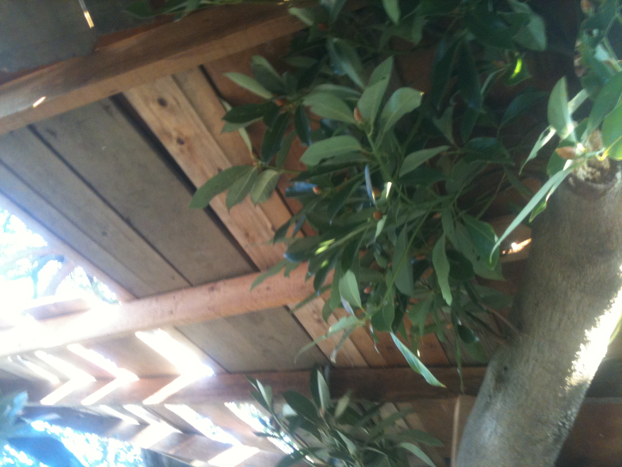 頭の上にたくさん広がって伸びている枝を梁にして